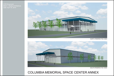 Two conceptual plans were prepared for a new 33,600 square foot Annex to display a full size model of the space shuttle. The Annex would contain a covered entry area, lobby, reception, main display hall, simulator, 2 classrooms, offices and support spaces. A cost effective warehouse space was proposed using a steel frame clad with aluminum panels. The main hall would include exhibits, educational material and an “observation walkway” over the space shuttle.