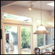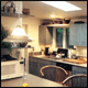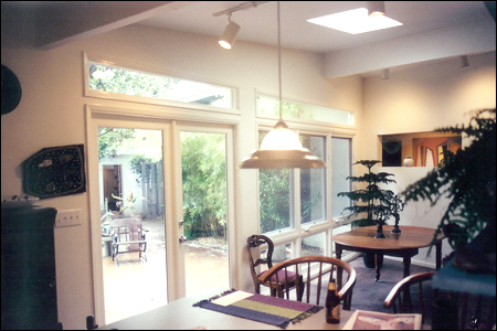 A modest remodel to a single story residence in Claremont included enclosing a patio space to create a new dining room, adding a breakfast counter, laundry nook concealed behind plywood sliding panels, new kitchen appliances and cabinetry. Display cases with low voltage lighting were building into the wall dividing the existing living room from the new dining area. Iron colored ceramic floor tile was extended from the living room throughout the new dining area and kitchen to connect these spaces.
